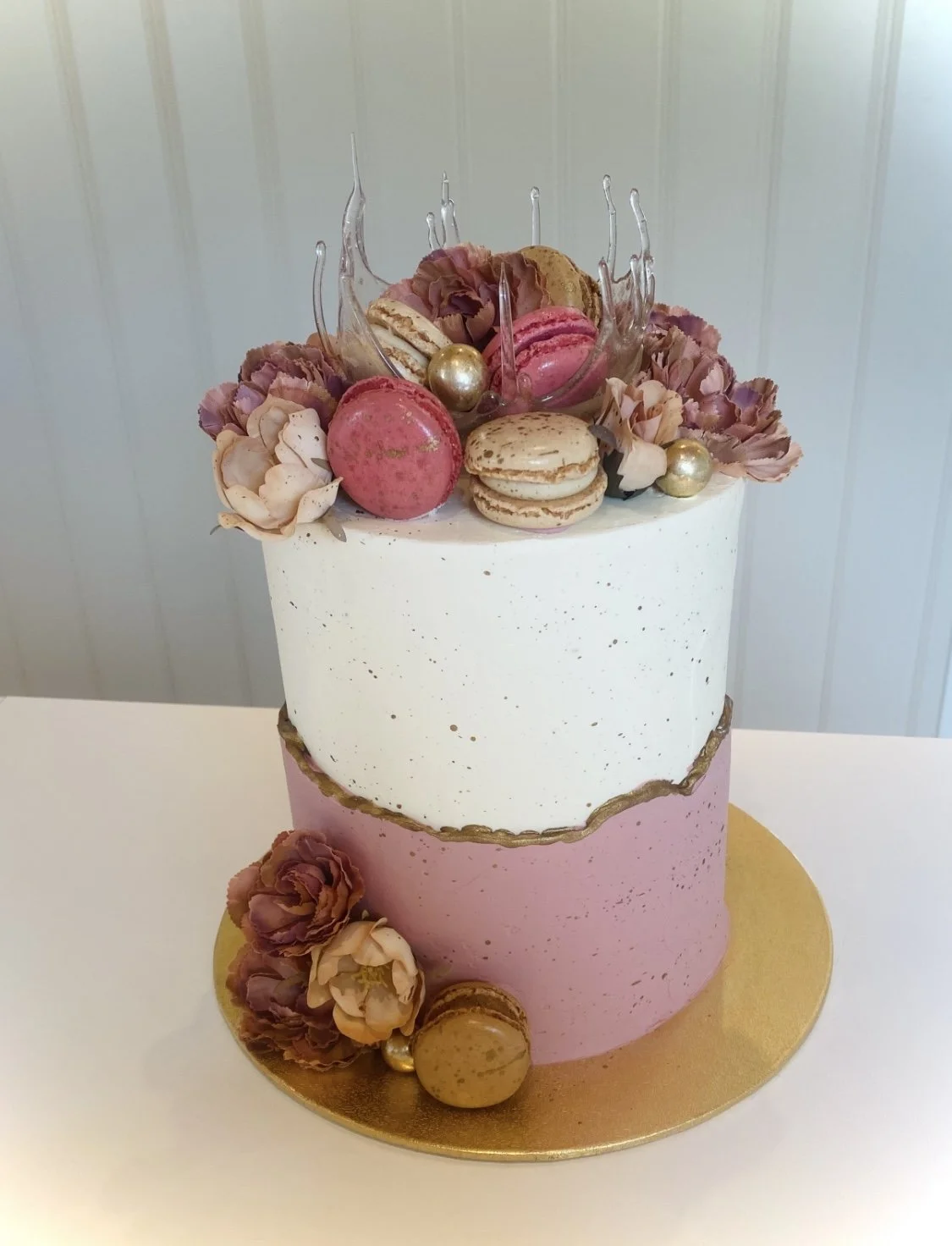 Med sine to etasjer blir kaken et imponerende midtpunkt på kakebordet. Kaken pyntes etter ønske, slik at den kan tilpasses tema, farger og stil, og passer utmerket sammen med andre kaker og søtsaker for et variert og innbydende kakebord.